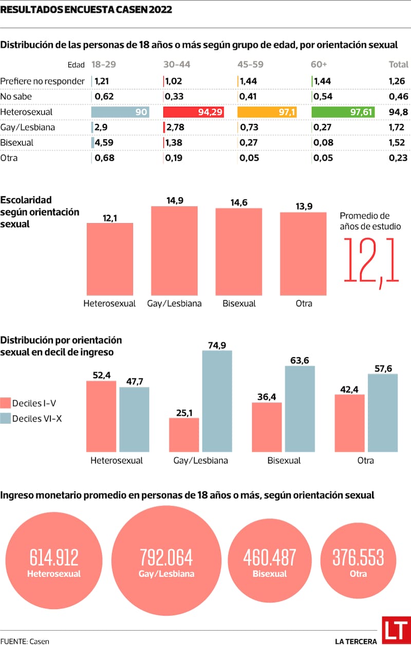 Según las cifras de la encuesta Casen, los adultos pertenecientes a minorías sexuales tienen más años de estudio, ganan más dinero y pertenecen a deciles más altos que el resto de la población. Por ejemplo, en Chile un heterosexual tiene 12,1 años de estudio en promedio. Tanto homosexuales como bisexuales, en cambio, tienen más de 14,5. Eso ayudaría a explicar la diferencia en las remuneraciones. En promedio, los heterosexuales ganan $614.912: un aumento de 21% respecto de 2017. La población gay y bisexual, en tanto, gana $792.064: un 38% más que hace cinco años. Los únicos que reciben menos hoy que en 2017 es la población bisexual. Hoy promedian $460.487, un 8% más bajo que en la última medición.