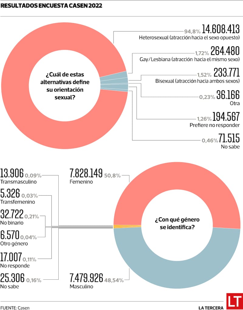 Las estadísticas de la Casen muestran un crecimiento de la población que se reconoce como homosexual y bisexual en los últimos cinco años. Los primeros pasaron de un 1,54% a un 1,72%, y los segundos, de 0,33% a un 1,52%. En el apartado de género, en cambio, sí hay grupos que se mantienen estables. Es la situación de la gente transexual. En 2017 representaban un 0,1% de la población mayor de 18 años. Hoy el porcentaje se mantiene, con un 0,12%, abarcando un universo de unas 19.232 personas a nivel nacional.