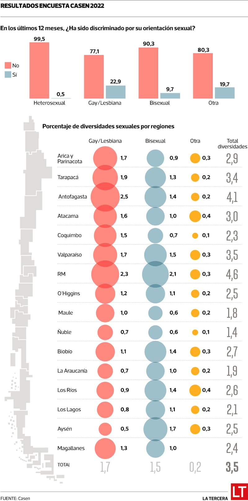 Tres años después se identifica como bisexual. Según la base de datos de la Encuesta Casen 2022, analizados por La Tercera, Catalina es parte del 3,5% de adultos que se identifica con alguna diversidad sexual. La cifra, que engloba a un universo de 534.417 personas, representa un crecimiento significativo respecto de la última medición de 2017. Esa vez, un 1,98% de los adultos dijo sentirse parte de alguna de estas minorías.