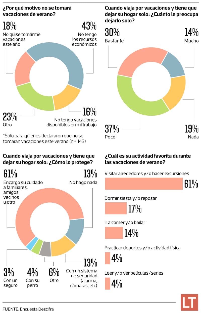 En este caso, uno de cada tres encuestados declaró que su presupuesto para vacaciones disminuyó en comparación a temporadas estivales anteriores. De ellos, un 66% indicó que sus planes vacacionales se vieron afectados por este cambio. Se preguntó también al grupo de no vacacionantes -que componen el 28% de la muestra del estudio- las razones por las que no lo harían: el 43% de ellos mencionó la falta de recursos monetarios como la principal razón de esta decisión, concentrándose esta cifra en los segmentos socioeconómicos más bajos. A su vez, el 18% indicó que sencillamente “no quise tomarme vacaciones este año”.