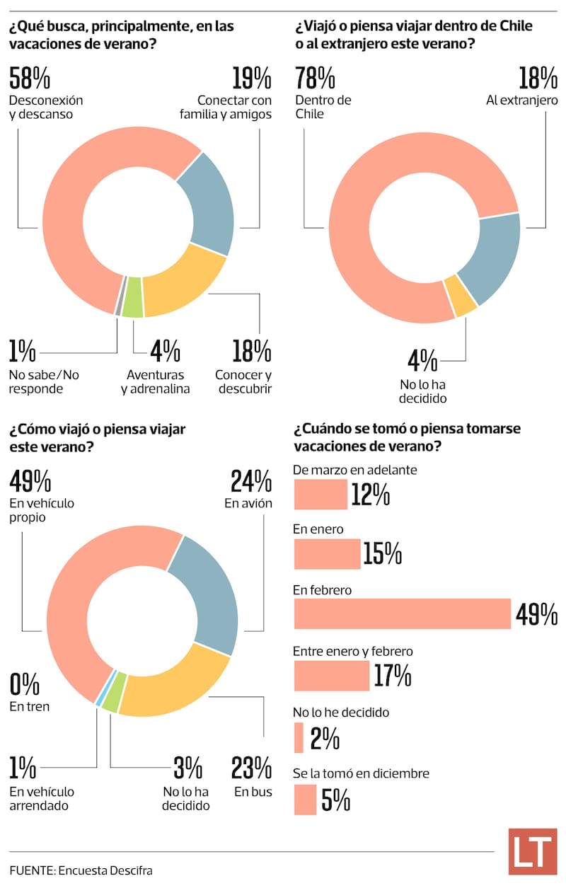Viajes con la familia, en febrero y en su enorme mayoría dentro del país. Así vacacionan los chilenos según un nuevo estudio de opinión pública realizado por Descifra -alianza estratégica entre Copesa y Artool-, destinado a comprender cómo las personas que tienen días de descanso -y los que no también- ocupan su tiempo y recursos. ¿El destino soñado? Europa.