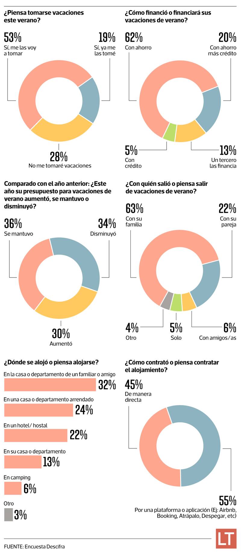 Quienes saldrán de vacaciones esta temporada lo harán en familia (63%), mientras que el 22% con su pareja. De acuerdo con la encuesta de Descifra, “el porcentaje de encuestados que declara que sale de vacaciones con su pareja tiende a aumentar a mayor edad. El porcentaje de quienes vacacionan en familia es mayor en los que tienen entre 35 y 54 años y en el segmento D+E”. A su vez, apenas el 6% reconoció que saldrá de vacaciones exclusivamente con sus amigos, mientras que el 5% dijo que lo hará solo.