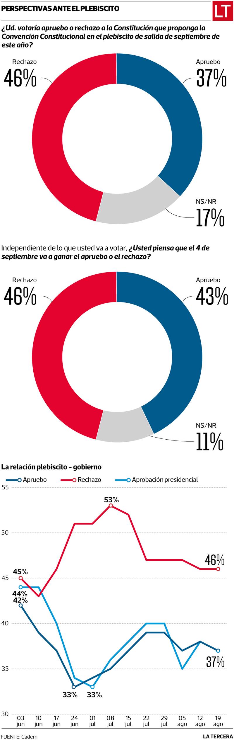 Con ese impedimento sobre la mesa, ayer algunas encuestadoras dieron a conocer las últimas mediciones previas al plebiscito. Ello, sin perjuicio de que en las dos semanas restantes seguirán sondeando al electorado y -en algunos casos- divulgando nuevas cifras pero de forma privada. Esto es lo que los números más frescos dicen respecto del próximo 4 de septiembre.