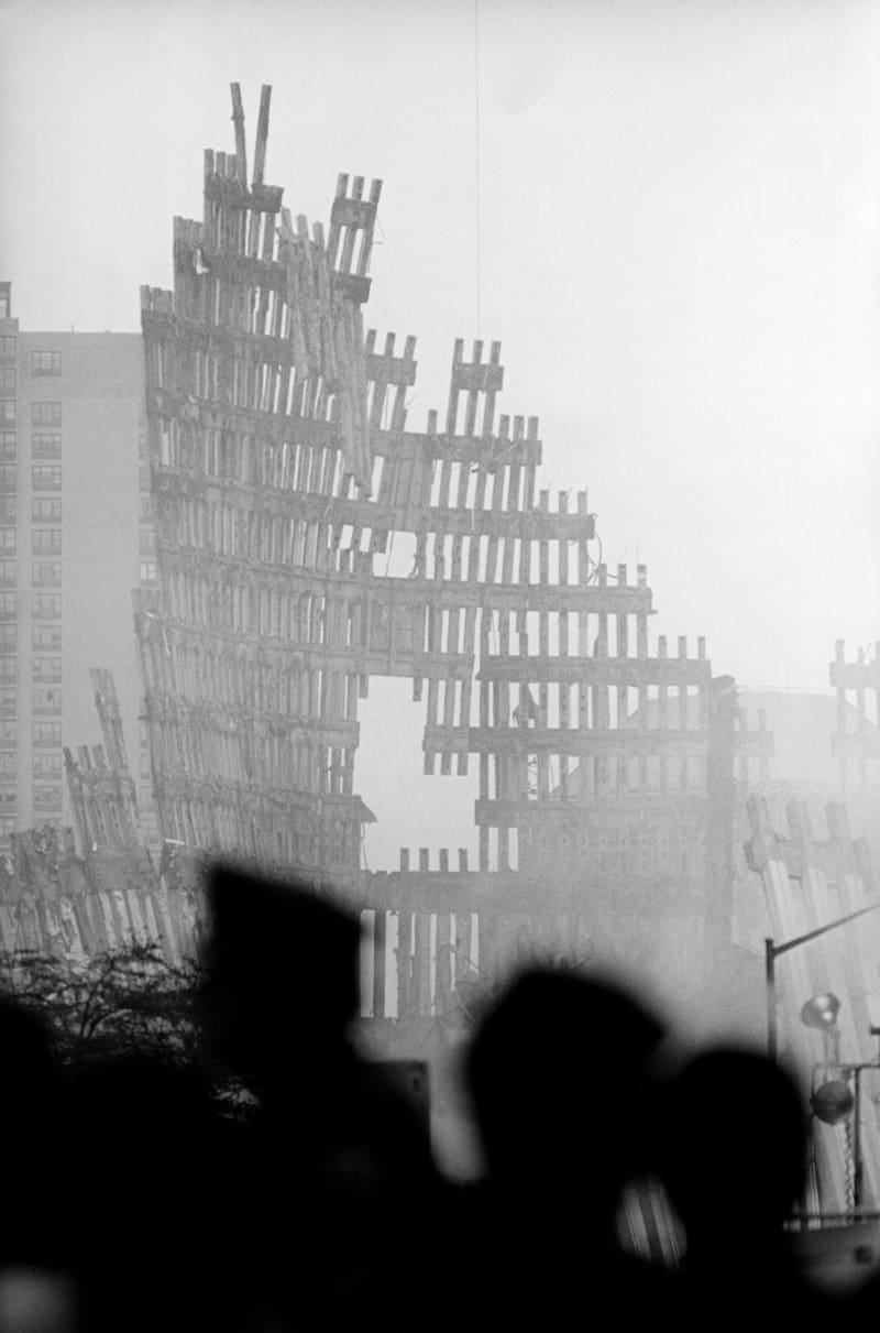 Bien podría haberle mencionado al editor de The Atlantic que, por supuesto, había una avalancha de fotógrafos trabajando en la Zona Cero, porque, por supuesto, eso era cierto. Y uno se pregunta si se puede aportar algo a la historia que aún no se haya dicho o mostrado que profundice la comprensión de la tragedia. Después de lo que se debe considerar un episodio de depresión, que duró un par de días, y luego de largas horas de discusión con mi esposa Janine, nos dirigimos a la Zona Cero el 20 de septiembre. Pero debo agregar que, en mi mente, antes de que llegáramos allí, y después, el sitio de los restos humeantes del World Trade Center me habló del 11 de septiembre y me hizo recordar fotografías de ciudades devastadas por la guerra de otras épocas, como Sarajevo, Dresden, Hiroshima y Berlín. Así que eso es lo que nos llevó a la Zona Cero por primera vez. Lo que nos mantuvo regresando fue una creciente necesidad de estar en contacto con los bomberos, las familias de los sobrevivientes, los equipos de limpieza. Eso podríamos hacer. También podríamos intentar poner visualmente los eventos del 11 de septiembre en contexto, como otro capítulo más trágico de un mundo casi siempre en guerra. Mi esposa Janine dice las cosas de forma más sencilla y directa que yo. Explicó que, en su mente, nuestro objetivo era expresar no simplemente cómo se veían las cosas en la superficie en la Zona Cero, sino cómo se sentían. Y ella tiene razón. Porque después de las terribles explosiones y la imposibilidad de encontrar sobrevivientes, lo que quedaba eran escombros humeantes, polvo e incluso con la multitud reunida, una especie de soledad inexplicable. La Zona Cero se había inundado de recuerdos, se había convertido en una especie de cementerio.