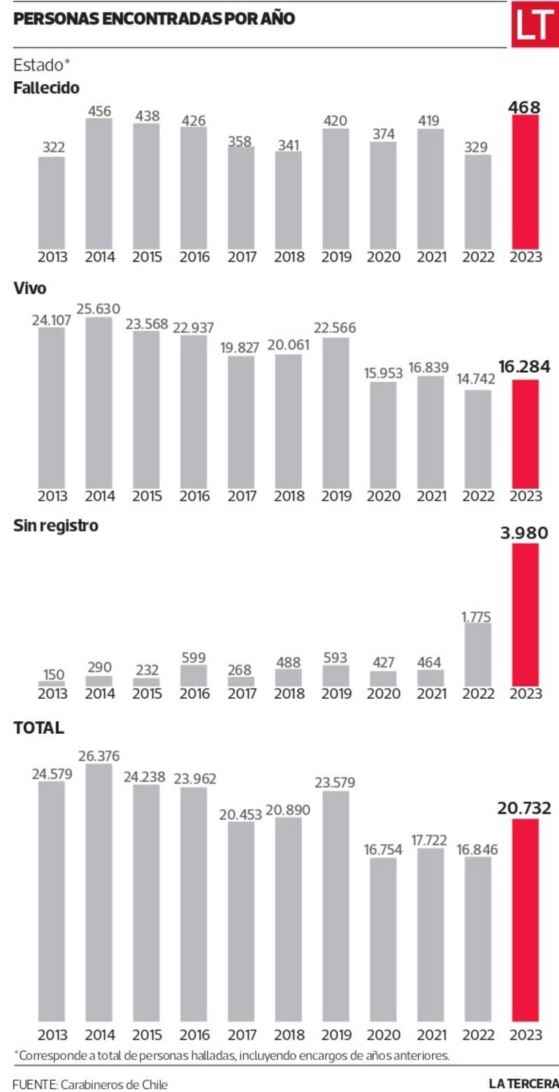 Además, existe una cantidad de personas halladas que no fueron correctamente registradas, explican desde Carabineros. En este grupo, detallan que un porcentaje menor son encontradas fallecidas, aproximadamente -sostienen- 400 personas por año.