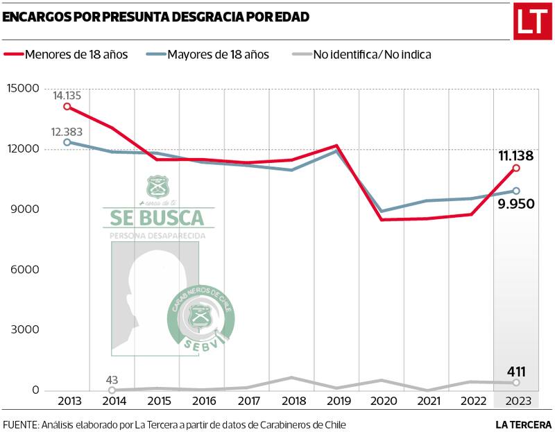 En esa línea, La Tercera analizó el registro de todas las denuncias por desapariciones desde el 2013 al 2023, entregadas por Carabineros a través de Transparencia. Los hallazgos son interesantes: según los datos emanados por la institución policial, hasta diciembre de 2023 hubo en concreto 21.499 denuncias por personas desaparecidas. En comparación a la cifra de hace 10 años, hubo un descenso, ya que fueron más de 26 mil los encargos en 2013.