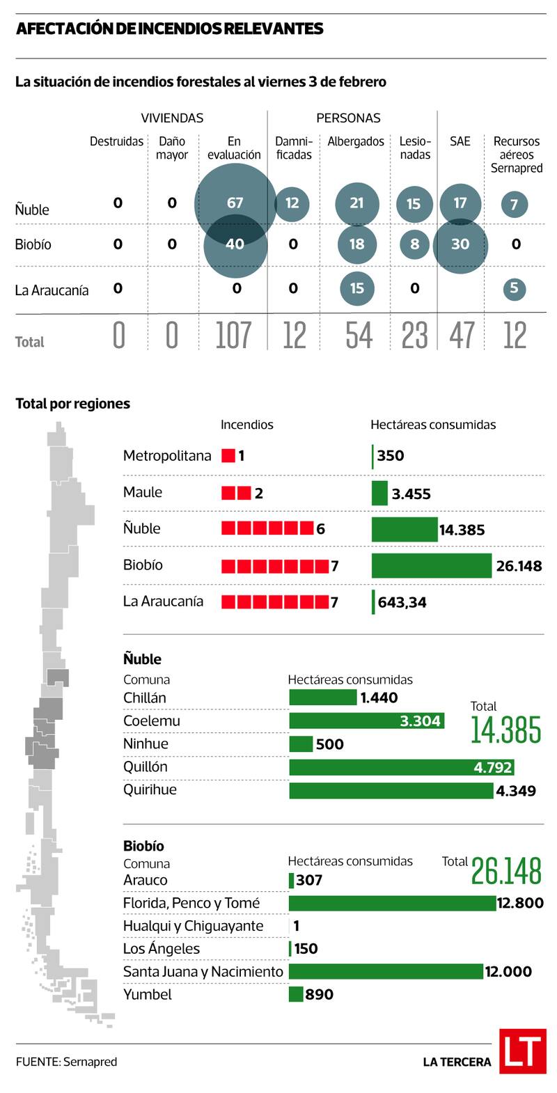 Al cierre de esta edición, el Servicio Nacional de Prevención y Respuesta ante Desastres (Senapred) informaba de 195 incendios forestales en el país, de los cuales 16 se producían en Ñuble, 83 en Biobío y 67 en La Araucanía. En las zonas de catástrofe, Ñuble presenta siete siniestros aún en combate, mientras que en Biobío hay 10 y en La Araucanía otros 16. Las viviendas dañadas y en evaluación por parte de las autoridades llegan a 107.