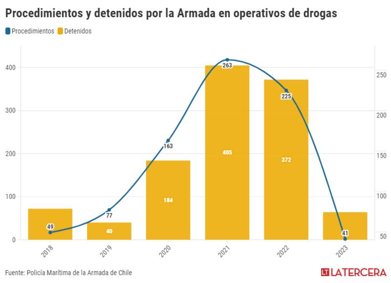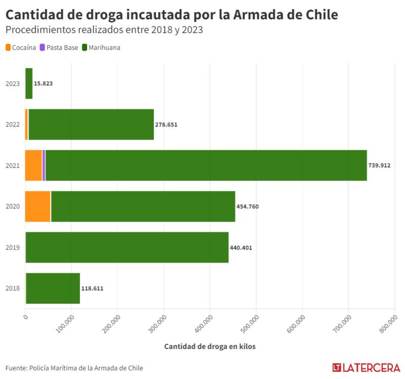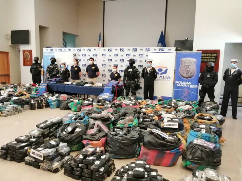 En las oficinas de la Policía Marítima, sus agentes valoran los golpes que han dado al narcotráfico. Con menos de 100 efectivos para toda la costa chilena, desde 2018 a la fecha, se han incautado más de 20 toneladas de droga (un 90% se trata de marihuana creepy) en 838 procedimientos en aguas del Pacífico. De estos casos, la Armada ha detenido a 1.137 personas, que según la entidad, aparecen desde ciudadanos chilenos hasta colombianos, peruanos, dominicanos e incluso un traficante sueco.