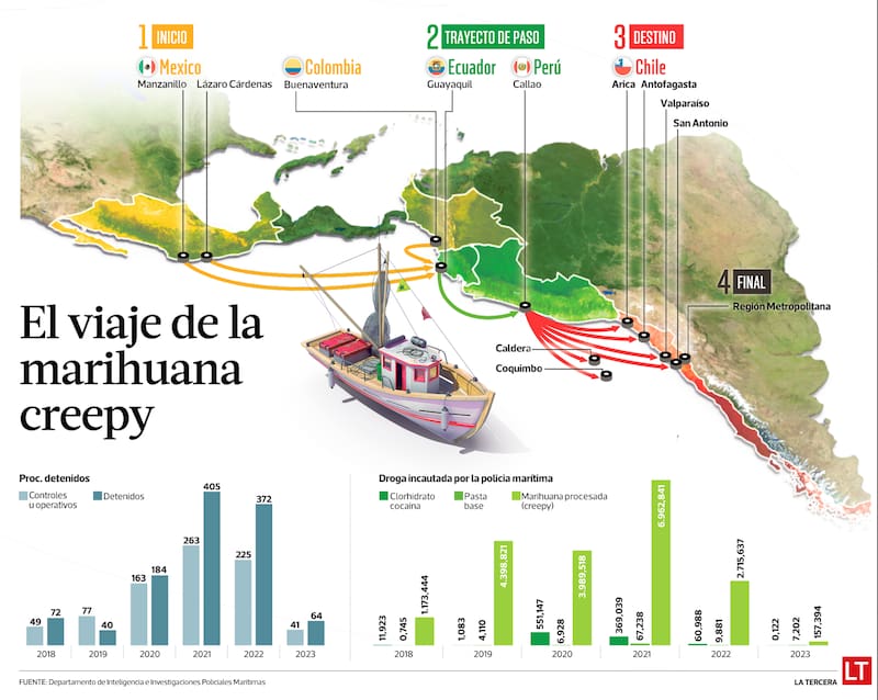 La pandemia no solo aumentó la demanda de drogas como el creepy, también obligó a los carteles a enviar sus productos por alta mar debido al cierre de las fronteras terrestres. Si en 2018 tenían un promedio de una tonelada por año en decomiso, en 2021 cerraron su trabajo con más de 7 mil kilos. En el proceso determinaron las principales rutas y aprendieron las nuevas técnicas que involucran desde lanchas de pescadores para ingresar droga a Chile, a tripulantes de grandes embarcaciones para llevarla a los mercados europeos.