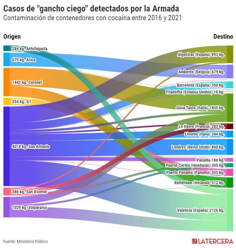 Un informe del Ministerio Público muestra que entre 2016 y 2021 se han detectado 36 de estos casos en diferentes puertos de Europa y Estados Unidos, sumando más de 37 mil kilos de cocaína incautada en contenedores que venían desde Chile.