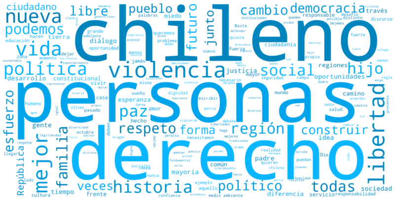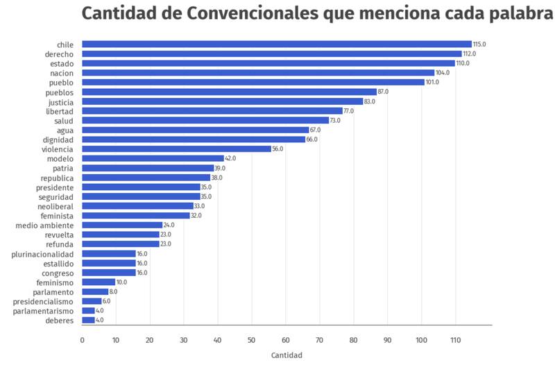Hay una palabra que aparece con distancia como la más repetida: el nombre del país. Chile apareció en 817 ocasiones y fue mencionado por 115 constituyentes, según el análisis de Unholster. Es decir, un promedio de cerca de siete menciones por cada uno de ellos.