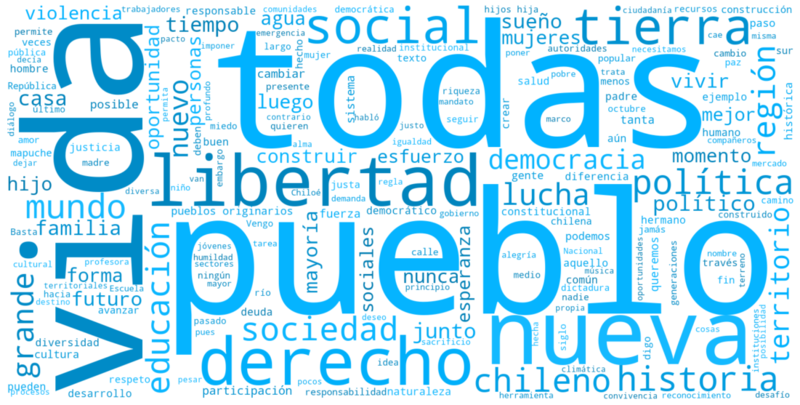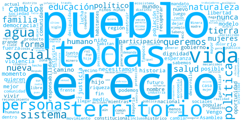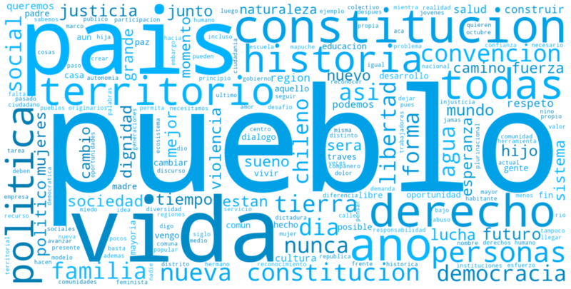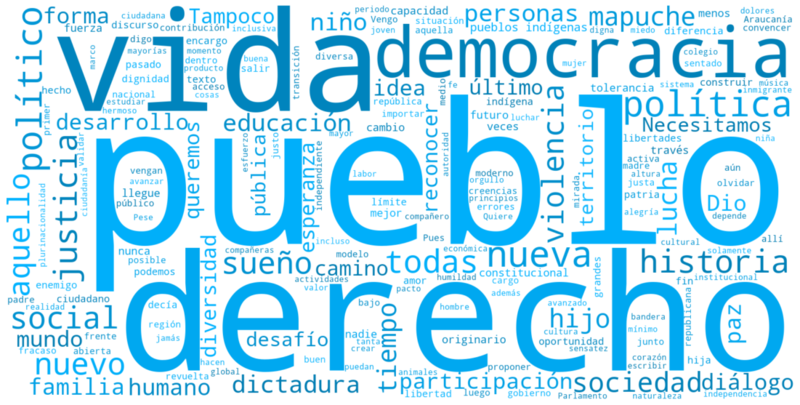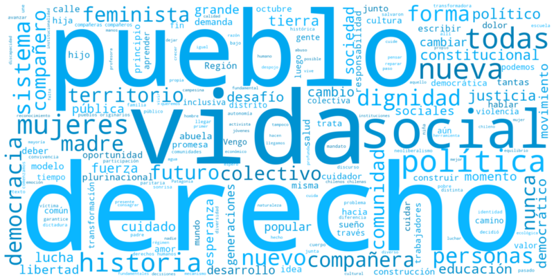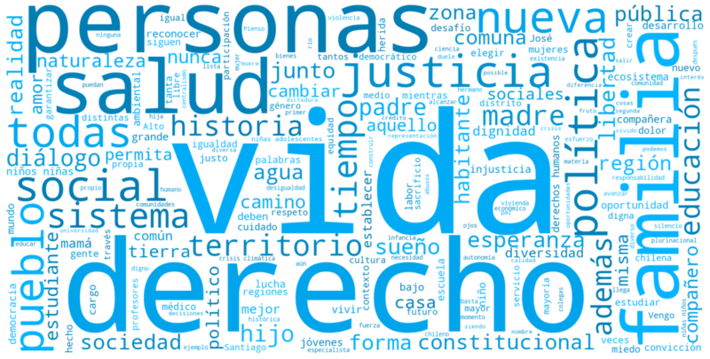 Luego de ellos, viene una serie de conceptos en que se empiezan a notar algunos de los enfoques temáticos de relevancia. Por ejemplo, “Justicia” fue mencionado por 83 constituyentes; “Libertad” por 77, “Salud” por 73, “Agua” por 67, “Dignidad” por 66 y “Violencia” por 56 representantes.