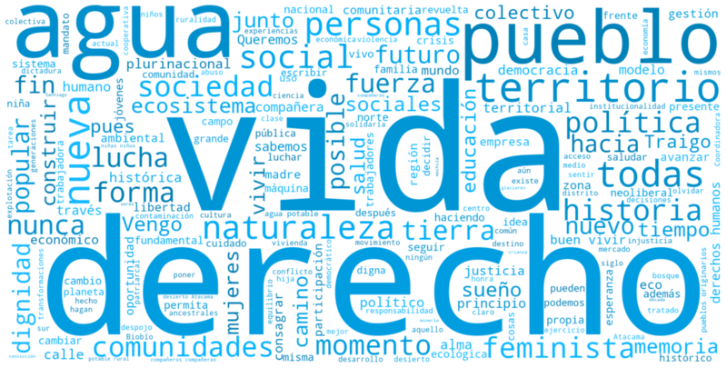 “Pueblo” y “territorio” también están presentes con relevancia en Pueblo Constituyente, el colectivo que agrupa a buena parte de los convencionales originalmente agrupados en La Lista del Pueblo. Acá, también, asoman “agua”, “naturaleza” y “educación” como palabras con peso importante.