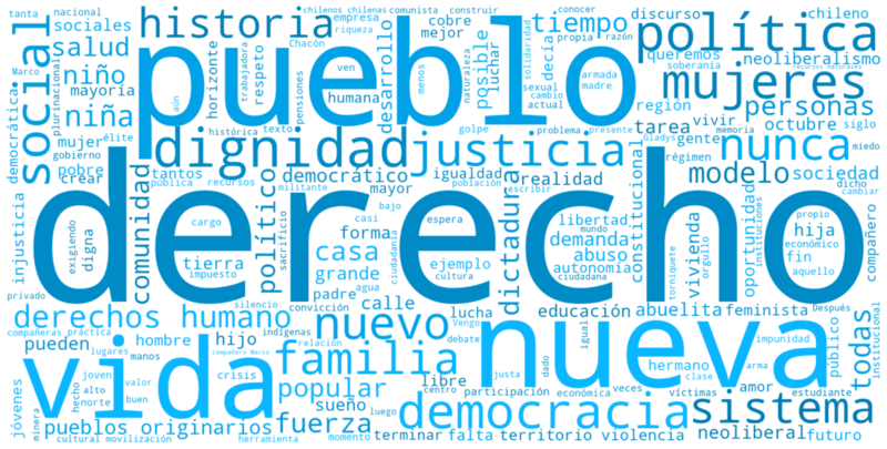 Y en un grupo adicional, aparecen palabras que, por lo habitual, tienen más énfasis en alguno de los bloques: “Modelo” fue mencionado por 42 constituyentes, “Patria” por 39, “República” por 38, “Presidente” y “Seguridad” por 35, “Neoliberal” por 33, “Feminista” por 32, “Medio Ambiente” por 24, “Revuelta” y “Refundar” por 23 miembros, “Plurinacionalidad”, “Estallido” y “Congreso” por 16, y “Feminismo” por 10.