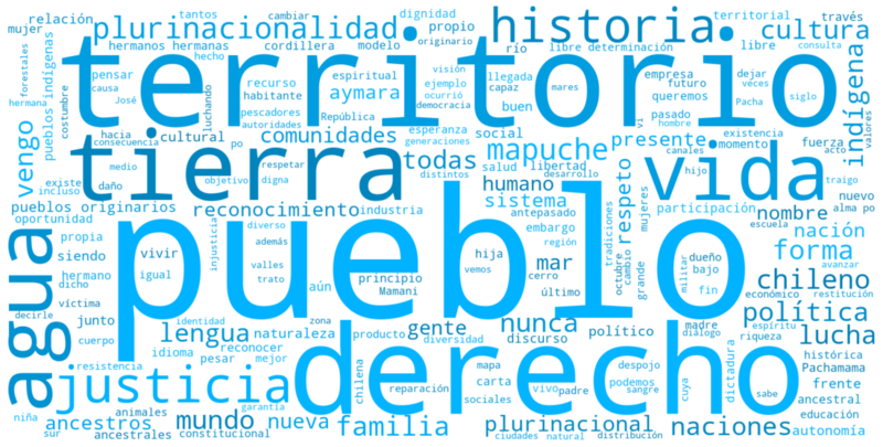 Una palabra que aparece en mucho menor magnitud en dicho conglomerado es “pueblo”, que sí está entre las protagonistas en todos los demás bloques. Por ejemplo, es la dominante entre los Pueblos Indígenas, donde también aparecen con alta relevancia conceptos como “territorio”, “tierra” y “agua”, seguidos después por otros como “plurinacionalidad”, “historia”, “justicia” y “lengua”.