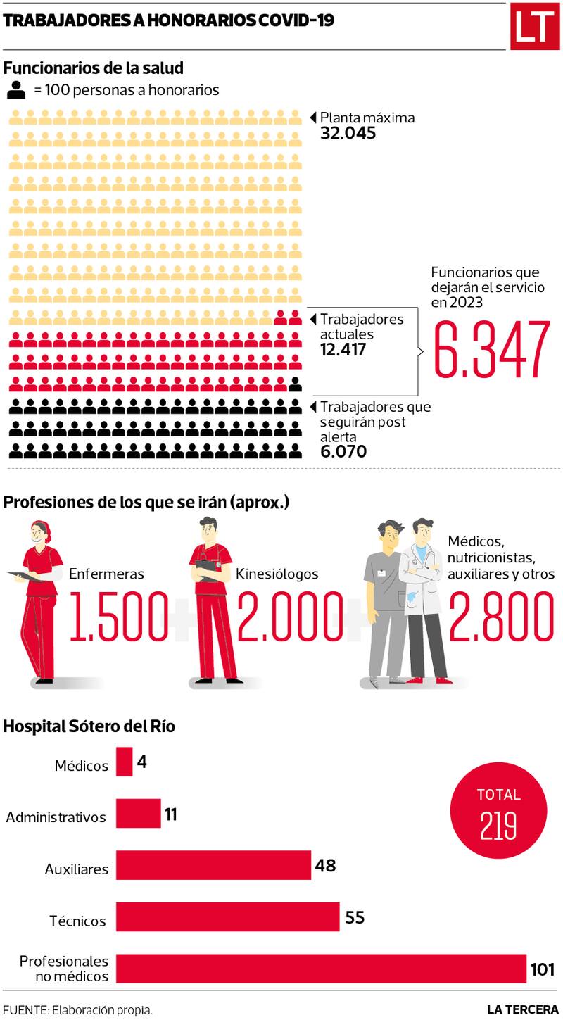 ¿Y quiénes son los que se van? Consultados por La Tercera, desde el Minsal no entregaron el detalle sobre a qué profesiones y hospitales pertenecen los funcionarios a los que se le dará por finalizado su contrato. Y esta es una información que tampoco la saben con exactitud los gremios o parlamentarios. Solo se ha conocido que se priorizará mantener a aquellos que trabajan en complejización de camas, hospitalización domiciliaria, laboratorio y urgencias hospitalarias.