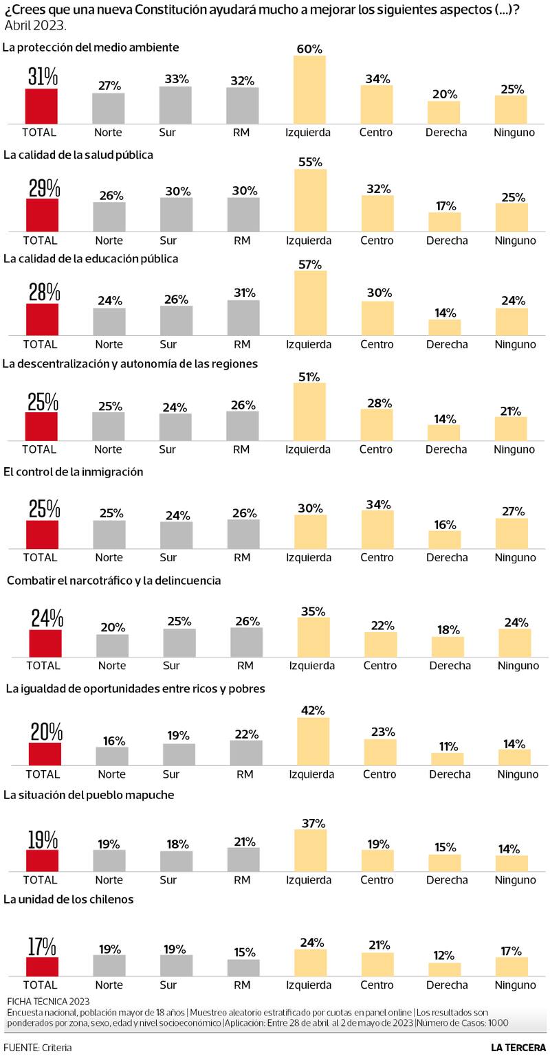 El aspecto en el que la izquierda se mostró más optimista fue la protección del medioambiente, ítem en que el 60% de ese grupo consideró que una nueva Carta Magna “ayudaría mucho a que mejore”. Lo sigue la calidad de la educación pública (57%), la calidad de la salud pública (55%) y la descentralización y la autonomía de las regiones (51%). En la otra vereda, apenas un 11% de las personas que se identifica con la derecha consideró que una nueva Constitución “ayudaría mucho a que mejore” la igualdad de oportunidades entre ricos y pobres, mientras que solo un 12% reconoció que mejoraría la unidad de los chilenos.