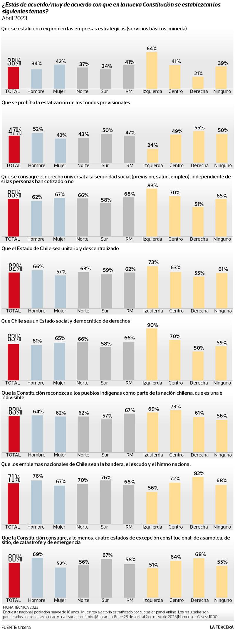 Por otra parte, un 39% dijo estar de acuerdo o muy de acuerdo con que “el tema constitucional sigue siendo importante para mí”, mientras que el 51% sostuvo que “el tema constitucional solo les interesa a los políticos”.