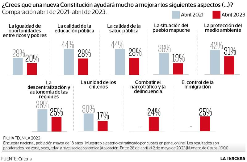 “La expectativa de la sociedad en torno a que una Constitución podría mejorar profundamente temas que eran relevantes para el país ha disminuido de manera significativa en los últimos tres años”, explica Cristián Valdivieso, director de Criteria. Así, por ejemplo, frente a la pregunta de si una nueva Constitución significará que mejore la unidad de los chilenos, apenas el 17% respondió que “ayudará mucho”. En abril de 2021, justo antes de la elección de la Convención Constitucional, ese porcentaje alcanzó el 30%, es decir, casi el doble.