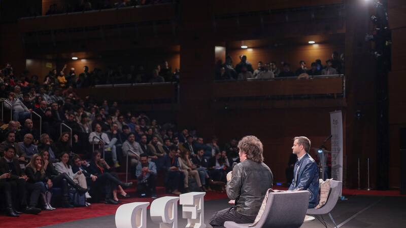 Tras las presentaciones, mientras Vamos por la gloria, canción de corte punk-rock de La Beriso sonaba, se escuchó un: “¡Viva la libertad, carajo!” desde arriba, en la entrada del teatro. Era Javier Milei que bajaba las escaleras y la gente se paraba a recibirlo y pedirle fotos, cual estrella del rock. Una vez abajo, nuevamente, tres veces su grito, y la respuesta de los asistentes llegaba con un “¡viva!” mientras mostraban, orgullosos, poleras con el rostro del candidato, banderas amarillas del libertarismo y los libros que esperaban fueran luego firmados.