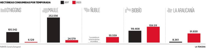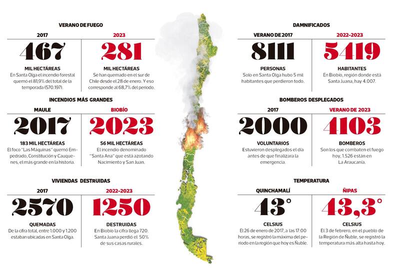 Los incendios en ambas localidades grafican, de alguna forma, las dos mayores destrucciones que suma el país. Entre ambos periodos suman 979.834 hectáreas, pero esta temporada aún no termina.