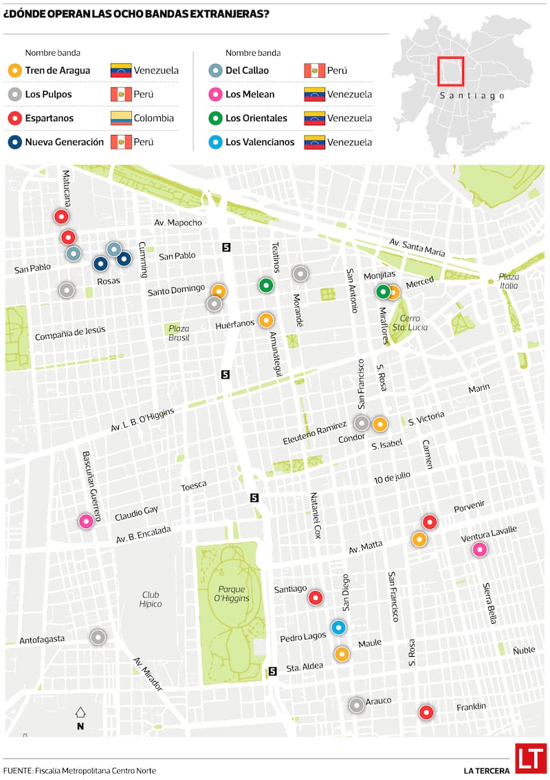 Así dan cuenta los antecedentes que maneja el Ministerio Público, en específico la Fiscalía Centro Norte, quienes levantaron un catastro de las bandas extranjeras que operan en la capital, georreferenciándolas por barrios y sectores (ver infografía).