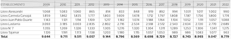 En su vecina Providencia, sostenedora de otros seis liceos emblemáticos (Alessandri, Carmela Carvajal, Juan Pablo Duarte, Lastarria, 7 y Tajamar), la matrícula ha sido más o menos estable en los últimos 14 años (de 2006 a 2009 no tienen registro digital). La evolución, de hecho, muestra años altos y bajos, con 2010 como el de mayor matrícula total (9.711) y 2015 como el más bajo (8.569). ¿Y 2022? Tienen 8.779 alumnos en sus liceos.