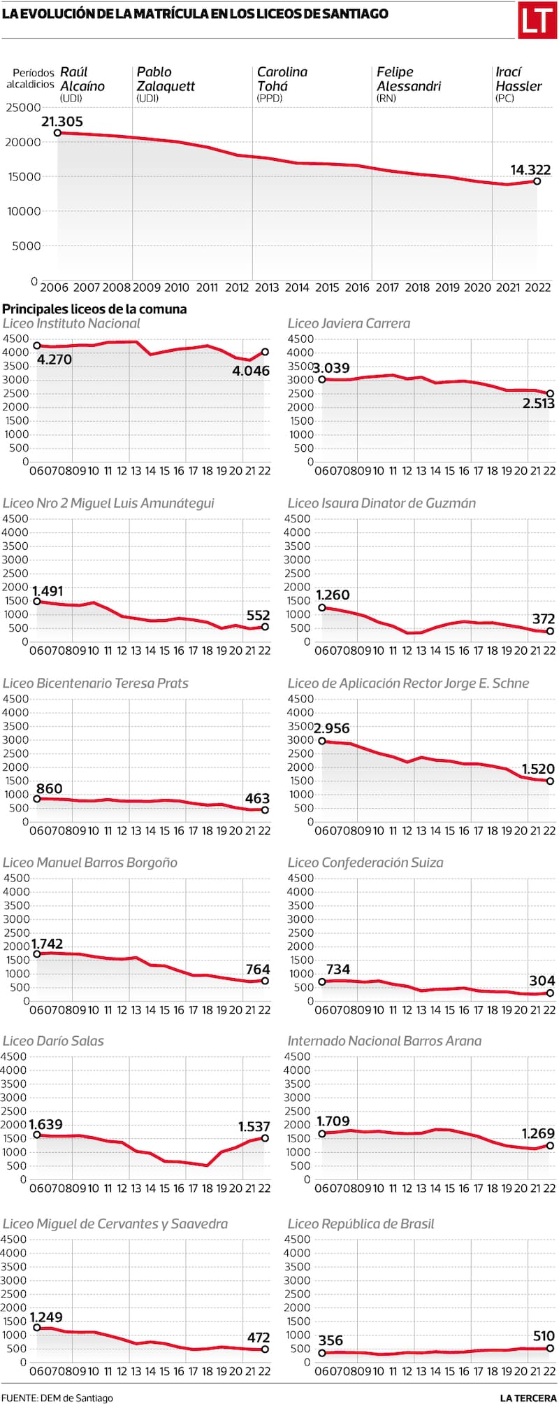 Después vinieron Carolina Tohá (PPD), que en cuatro años pasó de 17.638 a 16.573 (-6%), y Felipe Alessandri (RN), que bajó de 15.835 a 13.817 (-12,7%) en 2021, el año más bajo de la matrícula de los liceos emblemáticos de Santiago al menos tras el regreso a la democracia. El recuento llega finalmente a la actual alcaldesa Irací Hassler (PC), que comenzó su mandato en junio de 2021 con el año escolar ya iniciado y una matrícula de 13.817 estudiantes, logrando subirla este año a 14.322 (+3,5%), lo que se traduce en un aumento de 505 estudiantes.