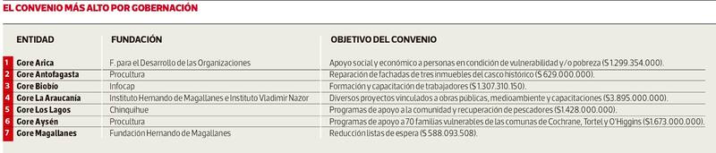 Los gobiernos regionales de Arica, Tarapacá, Antofagasta, Aysén y Magallanes también están siendo indagados por el Ministerio Público, pues hay denuncias que los vinculan a presuntos traspasos irregulares a fundaciones. En esos casos, igualmente, se habían propuesto proyectos de ayudas sociales, reparación de inmuebles patrimoniales y capacitaciones, entre otros.