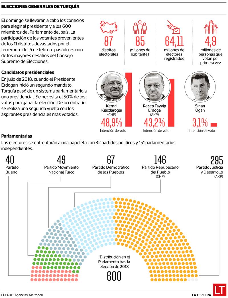“Para muchos en Turquía, estas elecciones serán decisivas para el futuro del país. No se trata de elegir un presidente o un nuevo Parlamento, sino de elegir qué tipo de futuro quieren para Turquía. Los partidos de oposición subrayan el retroceso democrático y el deterioro económico en los últimos años bajo el gobierno unipersonal de Erdogan. Y pretenden restaurar las reglas democráticas, el Estado de Derecho y los derechos humanos y, por lo tanto, iniciar un nuevo ascenso democrático. En el extranjero, las elecciones de Turquía se consideran las elecciones del año debido a la creciente influencia del país en las relaciones internacionales, especialmente en su vecindario inmediato. La Turquía de hoy es un actor clave en el contexto de la guerra ruso-ucraniana, en el Cáucaso, en Medio Oriente y el Mediterráneo. Teniendo uno de los ejércitos más fuertes de la OTAN, siempre es muy importante quién gobierna Turquía”, explica a La Tercera el analista turco Serkan Demirtas.