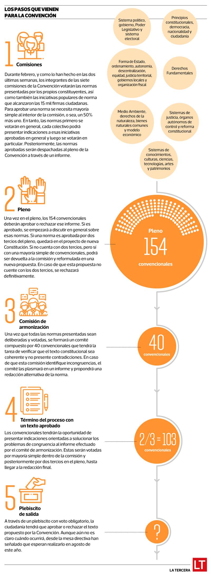 Una vez que las iniciativas sean aprobadas por la mayoría simple de su respectiva comisión, tanto en general como en particular, serán enviadas al pleno de los 154 convencionales, donde necesitarán de dos tercios para ser aprobadas.