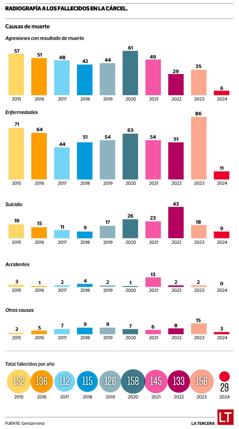 Los fallecimientos al interior de los penales representan una gran preocupación para las autoridades. Por lo mismo, se adoptan protocolos especiales, donde las causas que más se repiten son tres: enfermedades, riñas y suicidios. La primera representa el 44% de los decesos registrados entre 2015 y 2024.