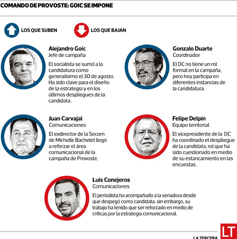 En medio de complejas semanas en las que se evidencia un estancamiento en las encuestas, al equipo de la senadora se sumó el exsecretario general de la DC y exalcalde de La Florida, Gonzalo Duarte. Este asumió como coordinador de la campaña y participa en el equipo territorial. Su instalación, dicen, viene a reforzar la labor de Goic, pero también del encargado territorial de la campaña, el vicepresidente de la DC, Felipe Delpín.