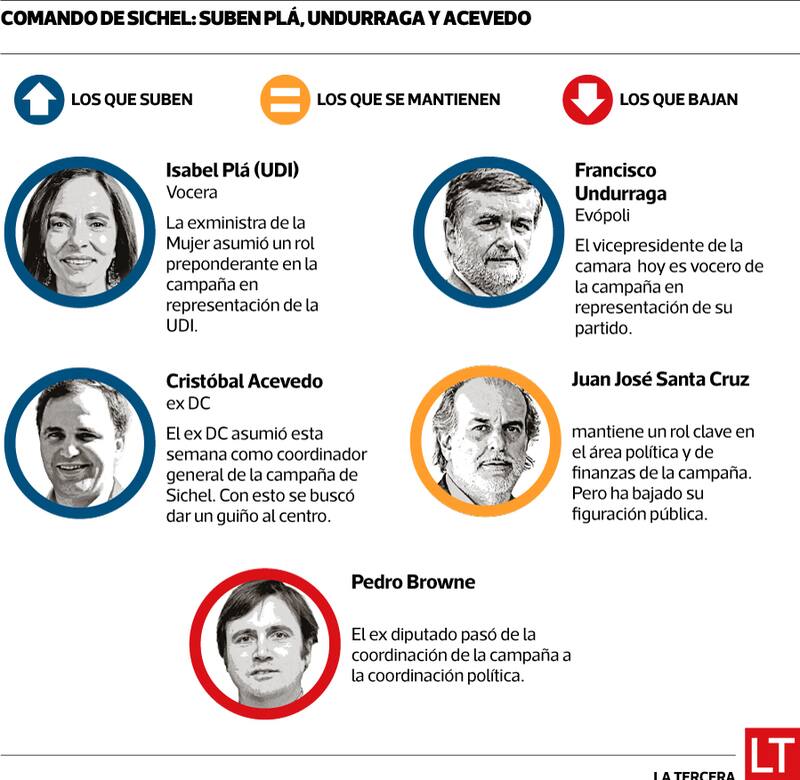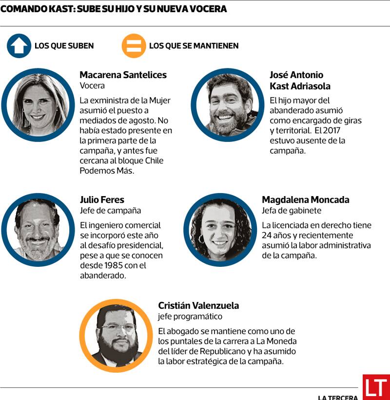 En el comando también destacan la incorporación de nuevos rostros que han ganado influencia, como su vocera, Macarena Santelices; su jefe de campaña, Julio Feres, y su jefa de gabinete, Magdalena Moncada.