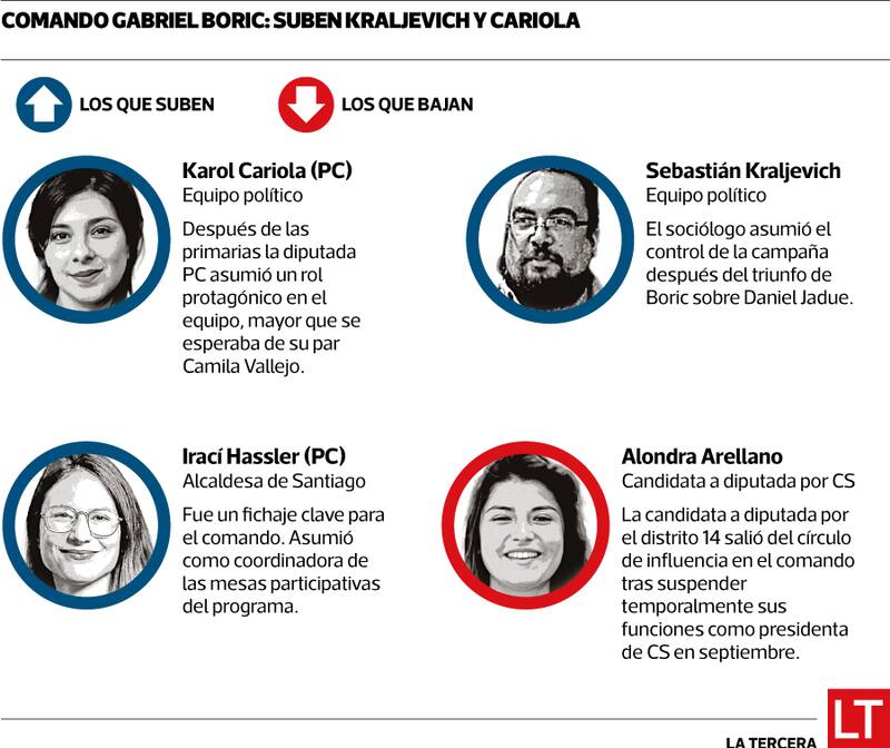Sin embargo, en el equipo del abanderado del Frente Amplio se han ido remarcando algunos liderazgos que han ido “subiendo” en el escalafón. Uno de ellos es la diputada del PC Karol Cariola, quien representa a su partido en el equipo político. Su rol, dicen en Apruebo Dignidad, se reforzó luego de que su par, Camila Vallejo, desistiera de ocupar un espacio de mayor influencia en el comando.