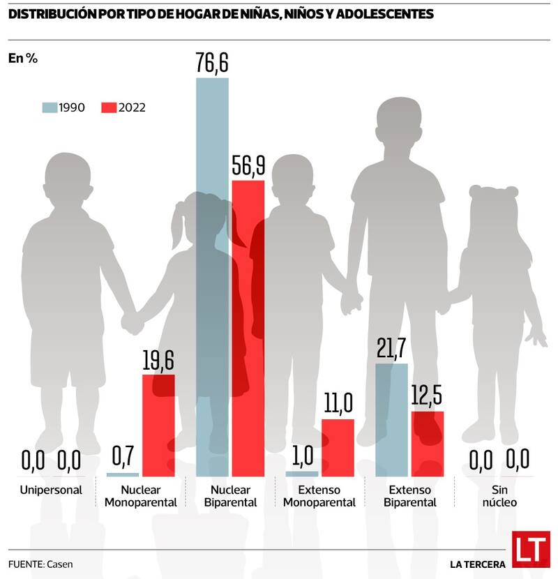 De acuerdo a las cifras, en 1990 los niños en hogares nucleares biparentales -es decir, el núcleo conyugal e hijos- disminuyeron significativamente: pasaron de representar un 76,6% a un 56,9% el año pasado. Y en los hogares extensos biparentales -padres, hijos y otros miembros- se repitió la tendencia, disminuyendo de un 21,7% a un 12,5%. Es decir, hubo una baja desde el 98,2% de niños en hogares biparentales (nuclear y extenso) a un 69,4%, es decir, casi 30 puntos porcentuales.