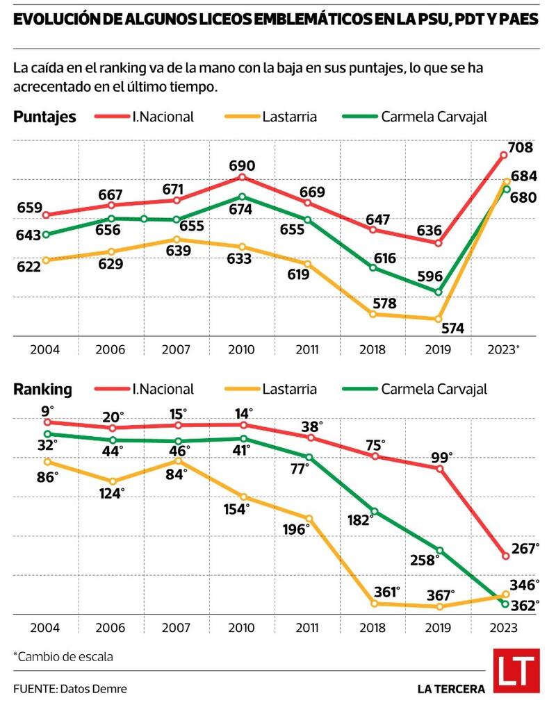 Una muestra: si en 2004 el Instituto Nacional (IN) de Santiago, quizás si el símbolo más elocuente de la crisis de la educación pública, lucía con orgullo su noveno puesto en el ranking de colegios de ese año, en 2019 cayó al 99 y en la reciente PAES apareció en un relegado 267 lugar. Pero no es lo único. Si en 2010 los institutanos lograban 690 puntos de promedio (cuando el máximo era de 850) en la PSU, en la Admisión 2022 llegaron a 620 y este 2023 promediaron 708, aunque ahora la máxima es 1.000 puntos.