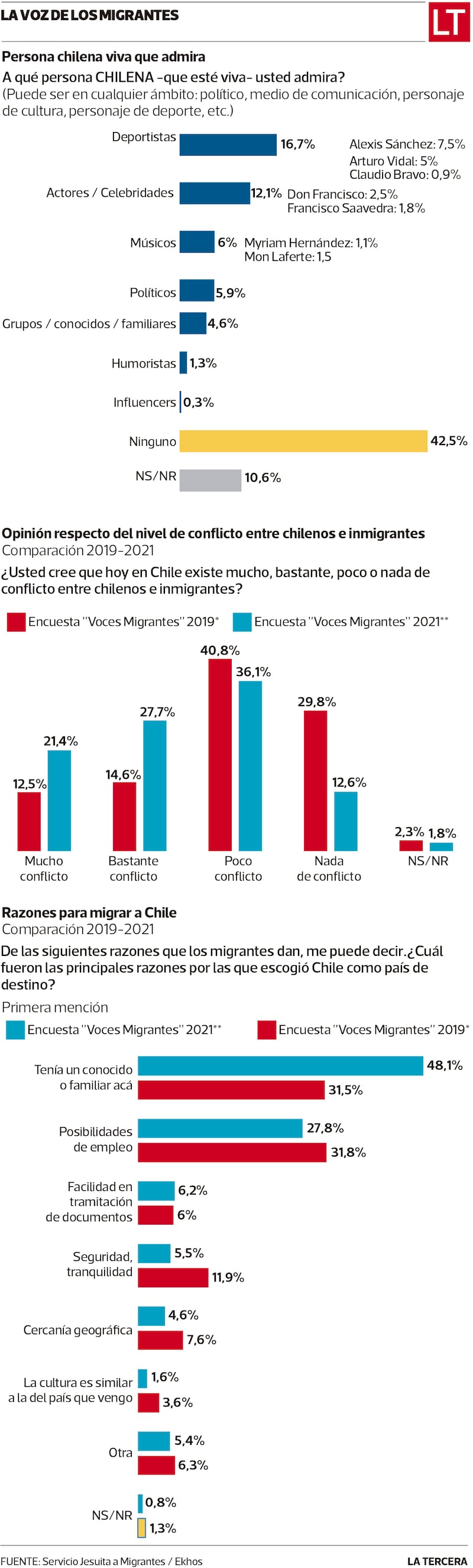 Si bien la comunidad de inmigrantes ha ampliado sus amistades a chilenos y chilenas, además de querer permanecer en el país, la encuesta detectó un importante desarraigo respecto de la cultura local. De hecho, el 42,5% dijo que no admiraba a ninguna persona chilena con vida en el ámbito de la política, los medios, la cultura y el deporte.