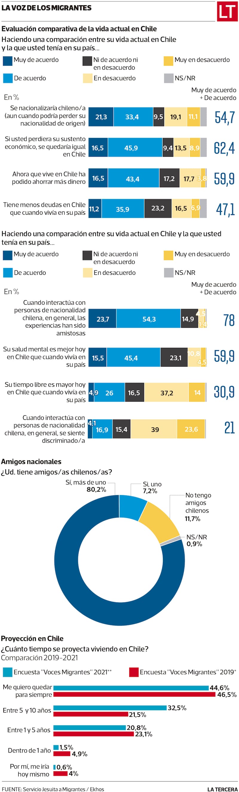 Una encuesta del Servicio Jesuita a Migrantes y la consultora Ekhos indagó en las preocupaciones de los inmigrantes que viven en Chile y el nivel de arraigo en el país, entre otras materias. Aunque el 49% de los encuestados reconoció algún tipo de desavenencia con los chilenos, 22 puntos más que en 2019, casi la mitad admitió que su idea es “quedarse para siempre” en el país. A su vez, el 80% dijo tener más de un amigo chileno.