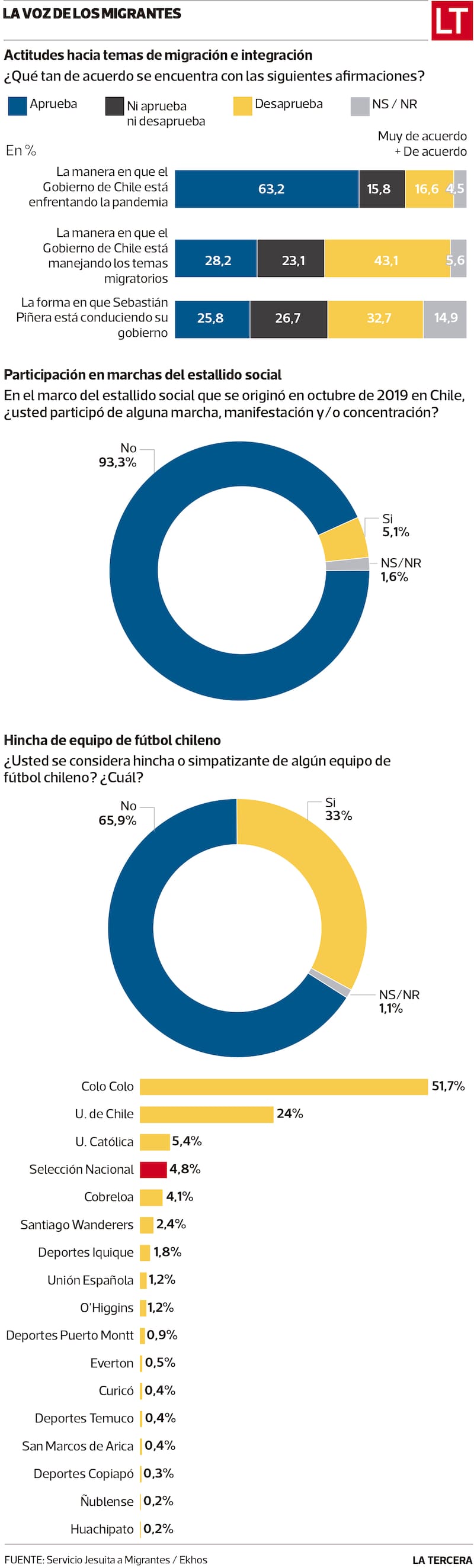 Por otro lado, seis de cada 10 evaluaron de manera positiva la forma en que el gobierno ha enfrentado la pandemia, pero el 43,1% desaprueba la manera en que el Ejecutivo de Sebastián Piñera ha manejado los temas migratorios.
