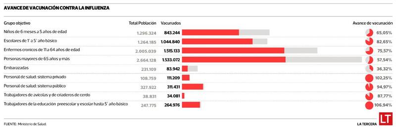 El proceso de inoculación contra la influenza comenzó el 6 de marzo y continuará hasta que se cumpla la meta del 85% a nivel nacional. A estado dirigida a funcionarios de la salud, adultos mayores de 65 años, niños hasta quinto básico, embarazadas, enfermos crónicos. Y hasta la fecha, 6.167.551 personas se han inmunizado contra el virus, lo que equivale al 69,4%.
