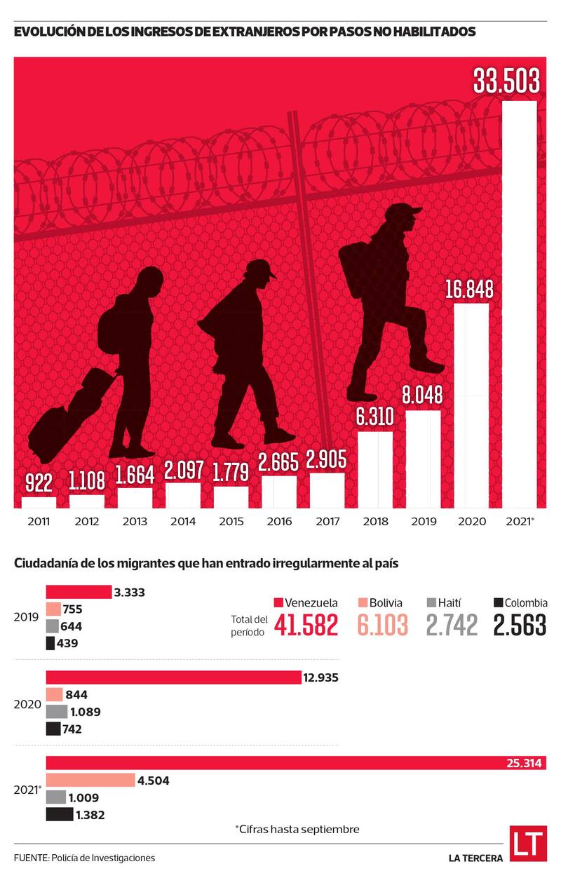 Las cifras de la Policía de Investigaciones dan cuenta de esto. Si en 2019 entraron 8.048 personas en esta condición, en 2020 la cifra se duplicó, con 16.848. Y este año se intensificó: a septiembre, iban en 33.503.