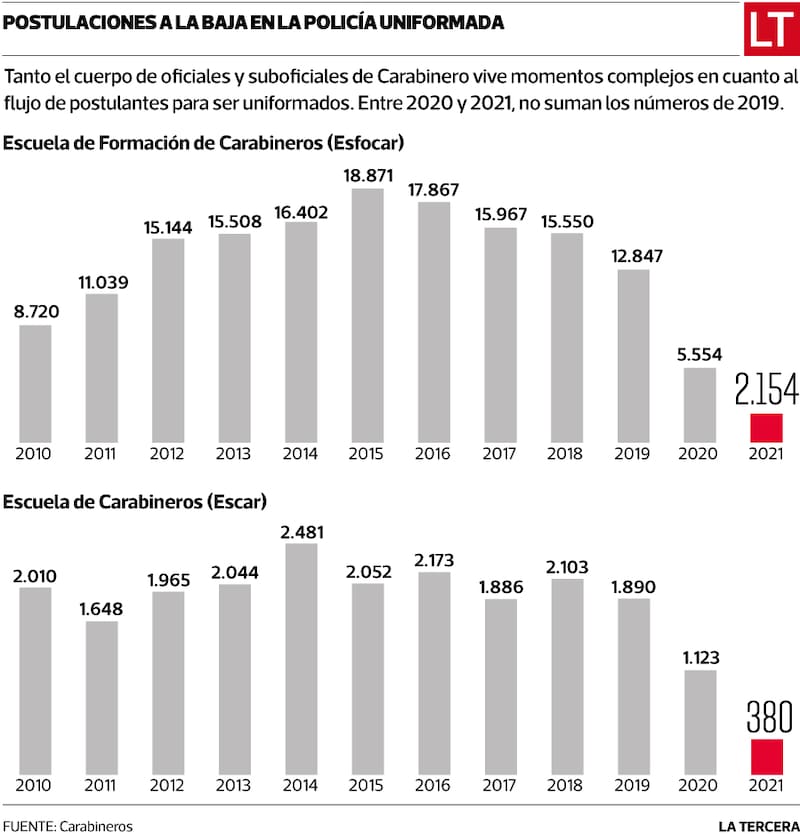 En los últimos 10 años, en promedio, 15.341 jóvenes postulaban anualmente a la Escuela de Formación. Este año -a casi tres meses del cierre de las inscripciones-, 2.154 han participado del proceso. Misma tendencia se repite en la entidad que forma a oficiales: entre 2010 y 2020, 2.137 personas, en promedio, mostraban interés en ser uniformados. Sin embargo, en 2021 no son más de 380 aspirantes. El “déficit” es una preocupación, tanto en el alto mando como en el gobierno.