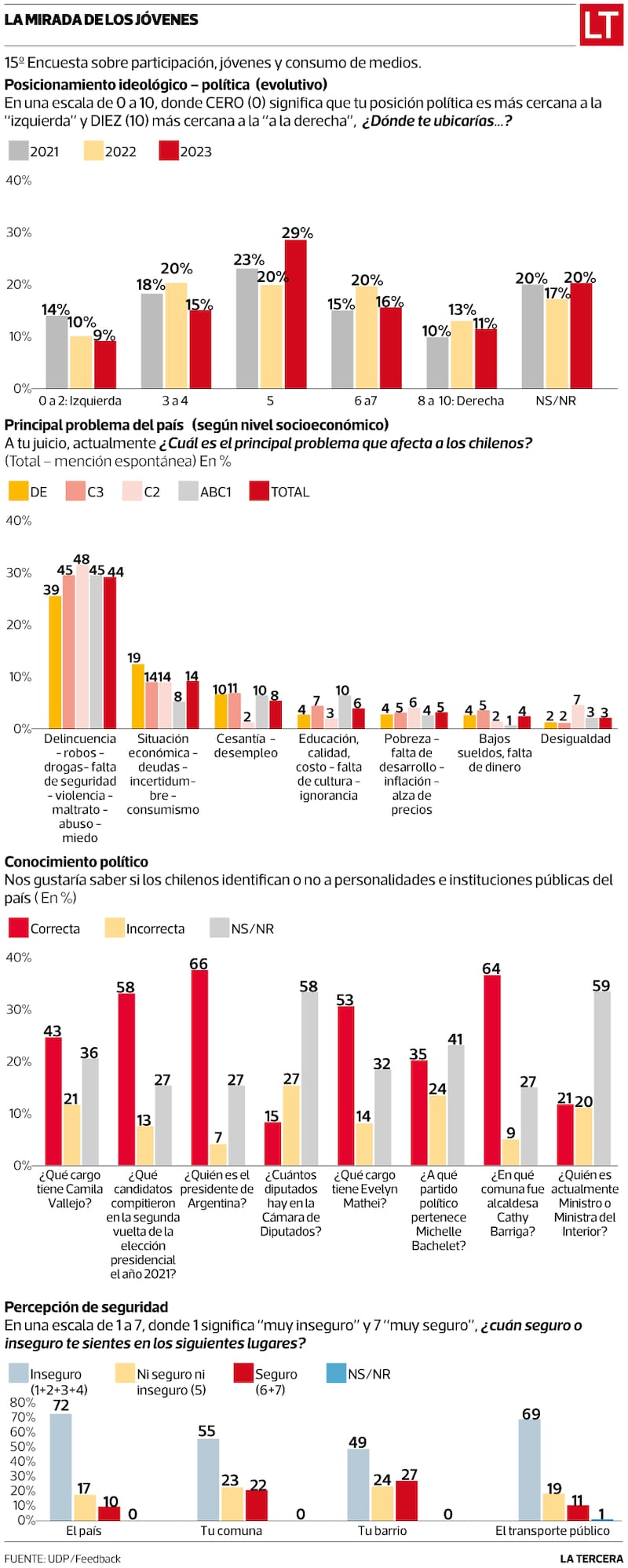 Los jóvenes -entre los 18 y 29 años- encuestados por Ciclos durante enero en su mayoría consideran que la seguridad y la delincuencia son el mayor problema del país (44%), situación que se evidencia en la alta percepción de inseguridad: un 72% manifestó sentirse inseguro en Chile. Comparado con datos Ciclos de 2011, la sensación de inseguridad aumentó más de 30 puntos en los últimos 12 años.