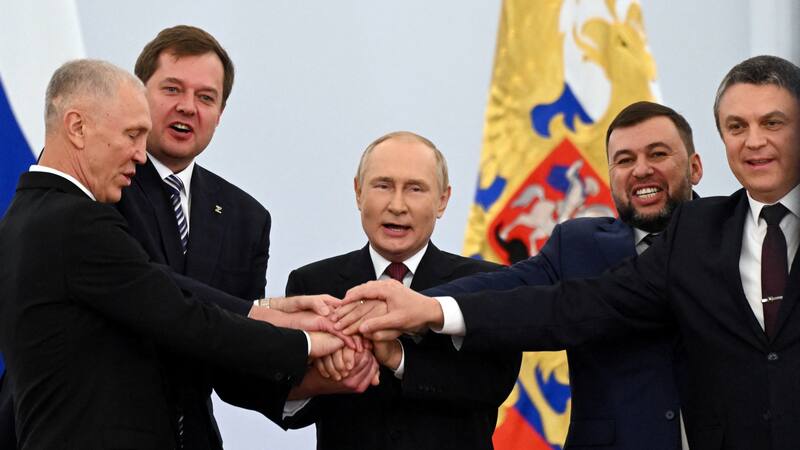 La ceremonia de firma, celebrada desafiando el derecho internacional, tuvo lugar en el Gran Palacio del Kremlin en presencia de las élites políticas del país, y se produjo inmediatamente después de referéndums orquestados por el Kremlin en Kherson, Zaporiyia, Luhansk y Donetsk.