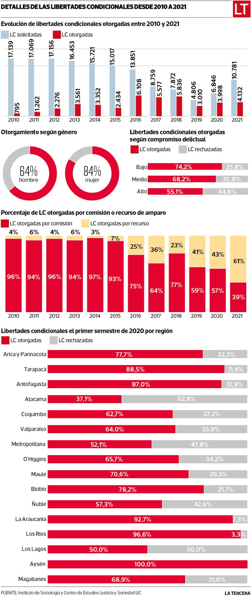 La investigación tomó como muestra las libertades otorgadas durante el primer semestre de 2020. Dicho estudio apunta a que los presos con bajo compromiso delictual son aquellos que tienen mayor número de libertades condicionales otorgadas en un 74,2% de los casos. Mientras que en los calificados como alto grado de peligrosidad, esa estadística disminuye al 55,1%.