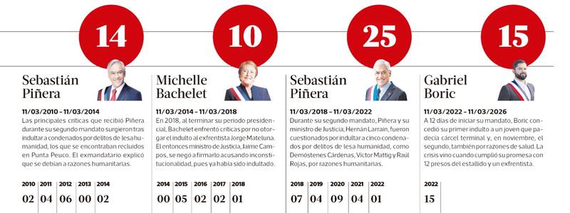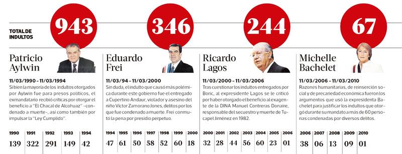 Como da cuenta el listado elaborado por el Ejecutivo, Eduardo Frei concedió 346 indultos, Ricardo Lagos 244, Michelle Bachelet 77 y Sebastián Piñera 39. En estos últimos dos casos, sumando los dos periodos en que ambos encabezaron el Poder Ejecutivo.