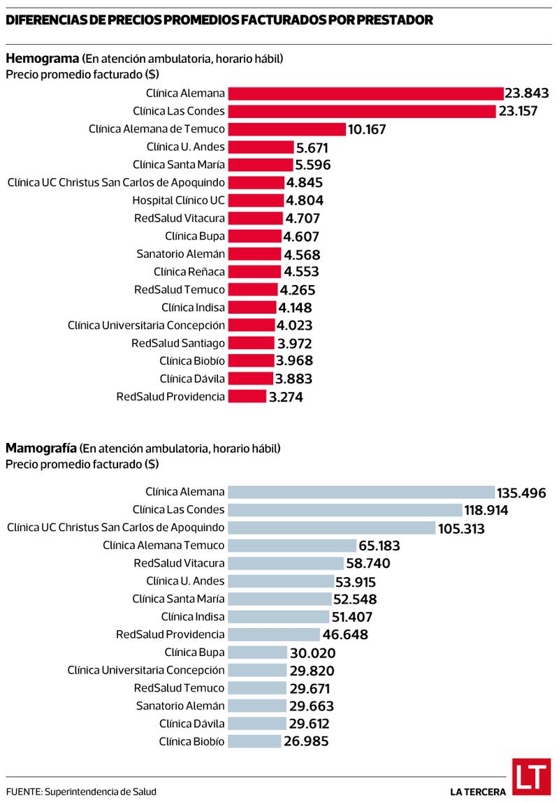 Este análisis, que tomó en cuenta los 14 exámenes más comunes de imagenología, y otros 10 de laboratorio, fue realizado por la Superintendencia de Salud, a partir de las facturaciones de los prestadores privados de las isapres y el precio promedio por atención en las 18 clínicas con mayor actividad en el país.