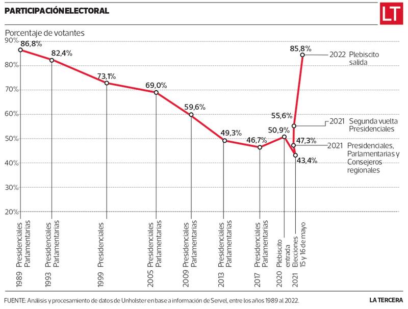 Hasta antes del inicio del proceso constitucional –en octubre de 2020–, la evolución de la participación electoral venía en caída, de acuerdo a datos del Servicio Electoral (Servel) procesados por la plataforma “Chile en 30 años: del retorno a la democracia al estallido social en datos”, lanzada por Unholster en alianza con La Tercera.