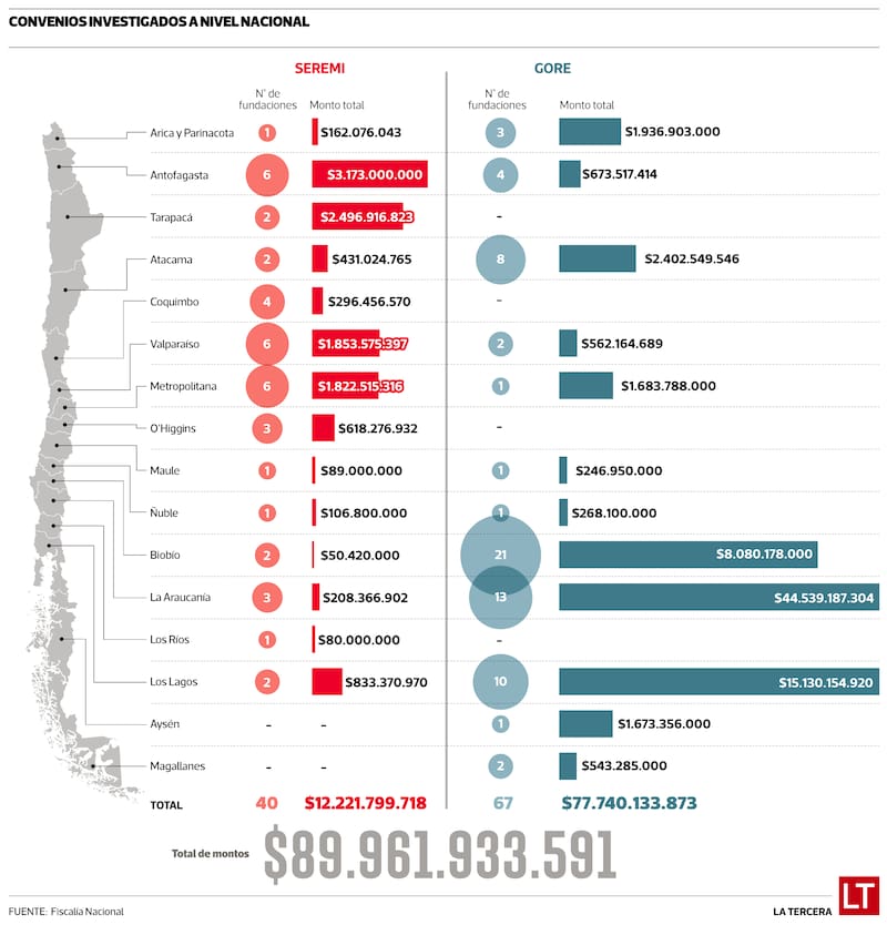 La indagatoria en contra de las seremis de gobierno suman $12.221 millones por convenios con 40 fundaciones. De estos, las regiones de Antofagasta, Metropolitana y Valparaíso son las que concentran la mayor cantidad de tratos con fundaciones pesquisadas, con seis ONG cada una, siendo la denominada “Perla del Norte” en la que se indaga la mayor cantidad de recursos: $ 3.173 millones.